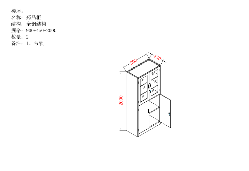 (四)全钢试剂柜2套,尺寸900*450*2000(mm),参数如下: