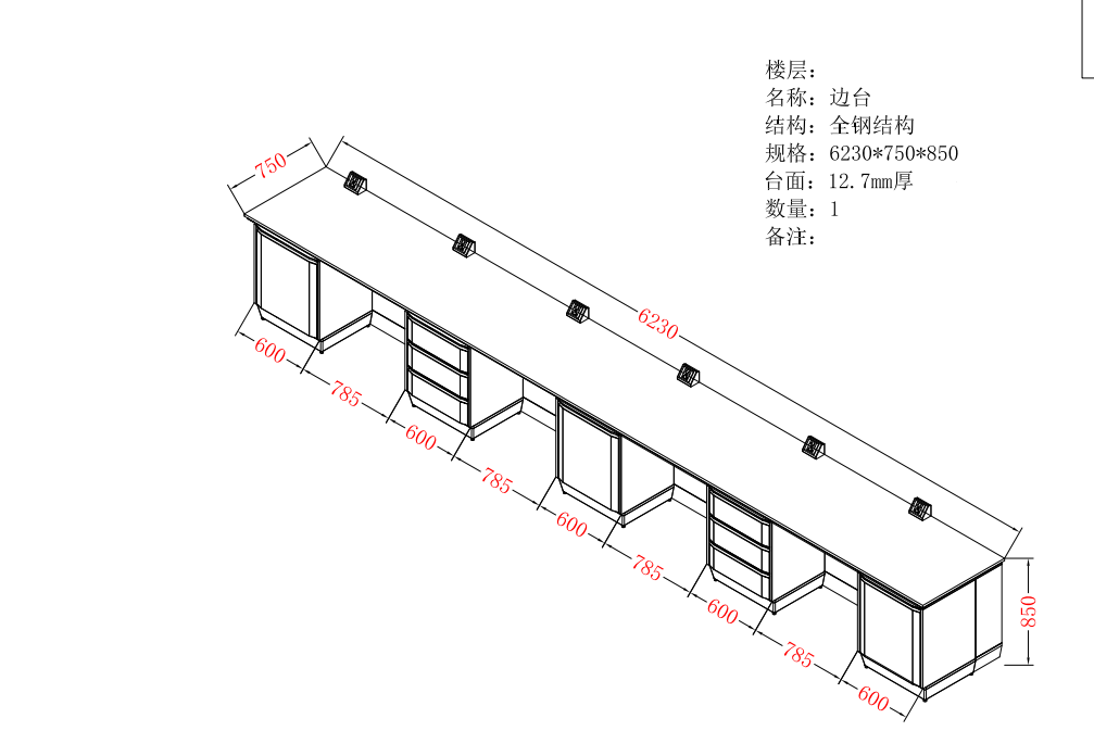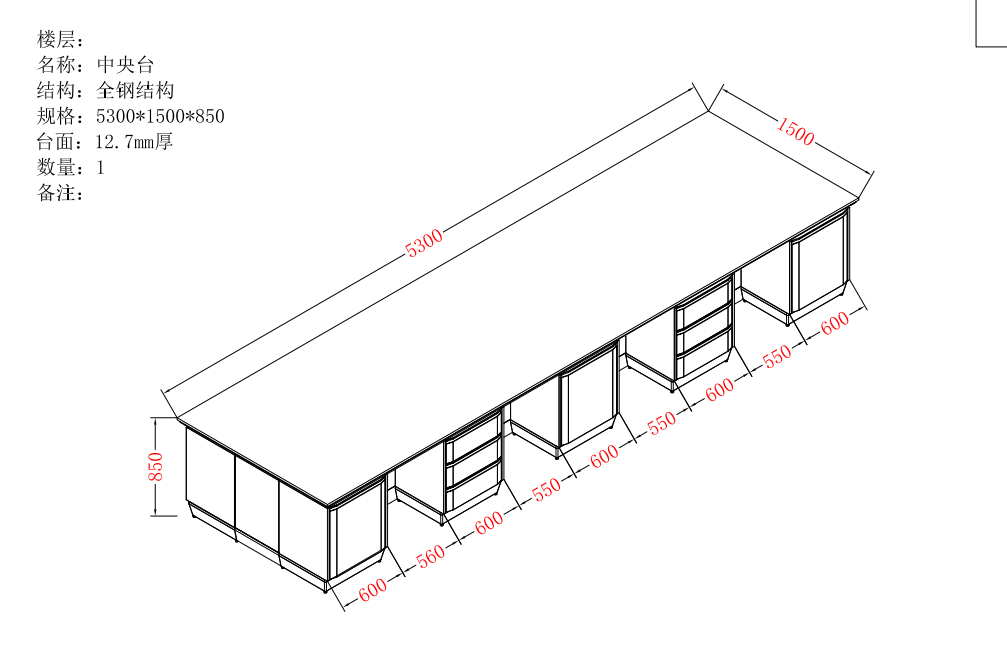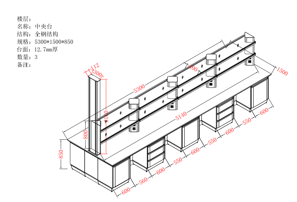 1、中央实验台尺寸为5300*1500*850(mm),实验边台尺寸为6230*750*850(mm),长、宽、高误差点≤3mm;邻边垂直度:台面对角线、框架对角线1000mm以下≤2mm; 1000mm以上≤3mm。