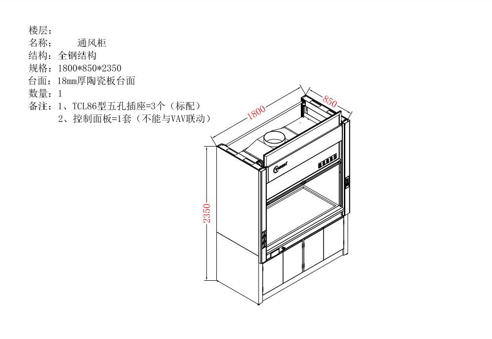 (三)全钢通风柜1套,尺寸1800*850*2350(mm)参数如下: